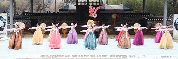 2018년도 대학혁신지원시범(PILOT)사업의 일환으로 실시된 이번 공연은 충남대학교무용단, 사)정은혜무용단, 국악원 사물놀이 팀이 출연해 풍물패 길놀이, 향로의 노래와 연꽃의 춤, 희망의 춤, 평화의 춤, 화합의 춤 등 백제 전통 및 문화와 관련된 춤을 선보였다.