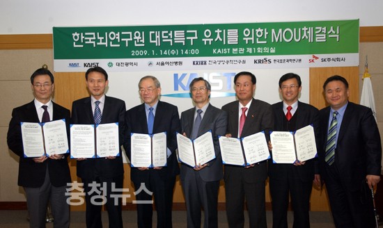 14일 오후 KAIST에서 김홍갑 행정부시장 서남표 KAIST 총장, 이정신 서울아산병원원장, 박영훈 한국생명공학연구원장, 김명수 한국표준과학연구원장, 박영호 SK주식회사 사장이 '(가칭)한국 뇌 연구원 대덕특구 유치를 위한 MOU'를 체결했다.
