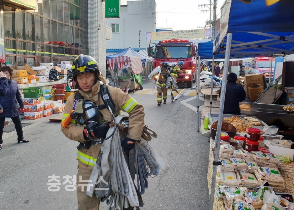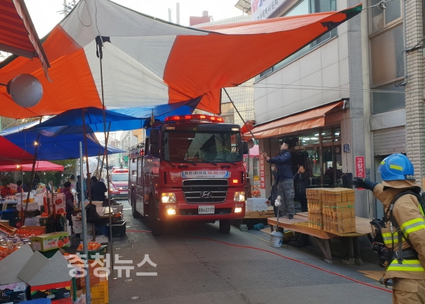 소방차 2대 투입 화재진압 훈련…좌판 등 장애물 제거 계도
