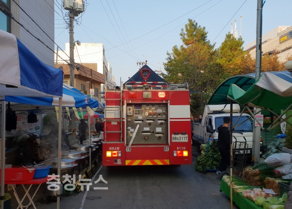 이날 훈련은 유성시장 내 화재신고로 소방차 2대가 현장에 신속하게 도착하기 위해 소방통로를 확보하고 화재를 진압하는 상황으로 진행됐다.