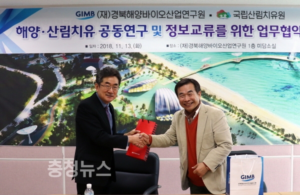 산림청 한국산림복지진흥원(원장 윤영균)은 지난 13일 국립산림치유원(원장 고도원)이 경북 울진군 죽변면 (재)경북해양바이오산업연구원(원장 김태영)에서 이 기관과 ‘산림·해양치유연구 활성화를 위한 업무협약(MOU)’을 체결했다.