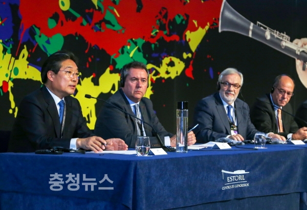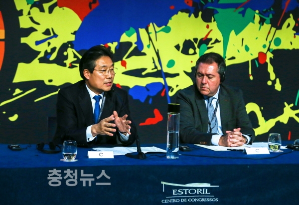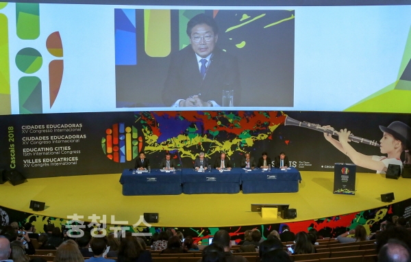 김홍장 당진시장이 지난 14일 포르투갈 카스카이스시 에스토릴 콩그레스센터에서 열린 제15회 IAEC(국제교육도시연합) 세계총회 시장단 토론에서 발표자로 나서 시의 평생학습 우수사례를 소개했다.