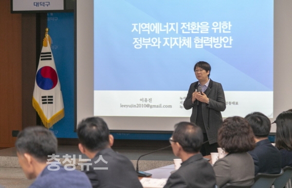 박정현 대덕구청장을 비롯한 대덕구 에너지경제과 등 각 부서 직원 50여 명이 참석한 가운데 먼저 지역에너지전환을 위한 전국네트워크 이유진 공동대표가 ‘정부의 에너지전환 정책과 지자체의 역할’이란 주제로 강연을 했다.
