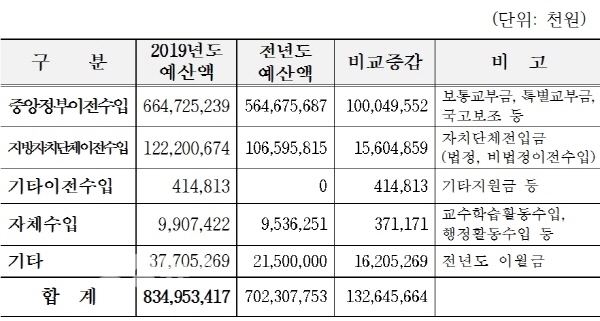 세입예산은 국가의 경기개선과 세입기반 확충 노력으로 내국세 및 교육세 수입이 증가될 것으로 전망되어, 지방교육재정교부금 등 중앙이전수입 6,647억 원, 지방자치단체이전수입 1,222억 원, 기타이전수입 4억 1천만 원과, 자체수입 99억 원, 기타 이월금 377억 원을 반영했다.