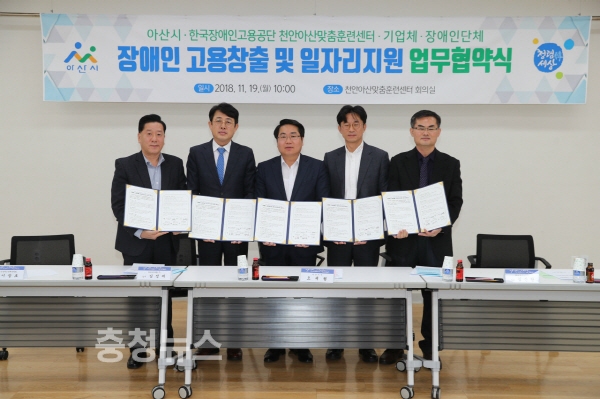 충남 아산시(시장 오세현)는 지난 19일 한국장애인고용공단 천안아산맞춤훈련센터(센터장 오세종) 및 ㈜하나마이크론(대표 한호창), ㈜KB오토시스(대표 김신완), 아산시장애인단체연합회(회장 이창호)와 천안아산맞춤훈련센터 회의실에서 장애인 고용 창출 및 일자리지원을 위한 업무협약을 체결했다고 밝혔다.