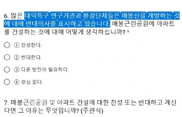 ‘많은 대덕특구 연구기관과 환경단체들은 매봉산을 개발하는 것에 대해 반대의사를 표시하고 있다’고 못 박은 뒤 의견을 묻는 등 질문 자체의 정당성 역시 의심받고 있다.