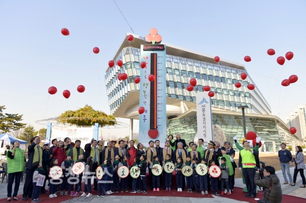 20일 세종시청 광장에서 열린‘희망2019나눔캠페인’출범식과‘사랑의 온도탑’제막식에는 세종시의회 안찬영 부의장을 비롯해 이춘희 시장, 최교진 교육감 등 각 단체장, 시민들을 포함해 총 150여명이 참석했다.