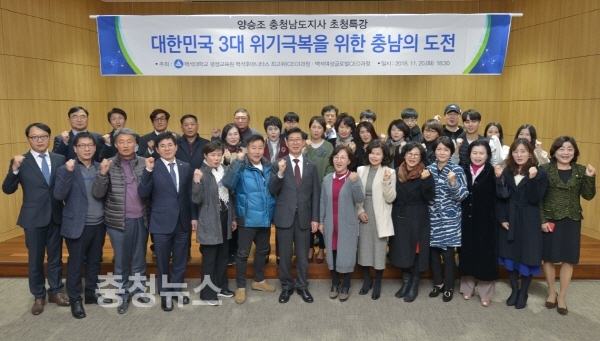 백석대학교(총장 장종현)ㆍ백석문화대학교 평생교육원은 20일 교내 글로벌외식관 5층 세미나실에서 양승조 충청남도지사를 초청해 ‘대한민국 3대 위기극복을 위한 충남의 도전’이라는 주제로 특강을 진행했다.