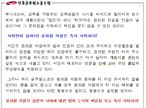 노조는 "윤차원 의원은 절대 외부에 유출하지 않겠다던 내부 문건을 직접 이해 당사자인 계약직 노동자에게 의도적으로 유출하고, 이제와서 문제가 불거지니 스스로 피해자 코스프레를 하는 어처구니 없는 행태를 보이고 있다"고 밝혔다.