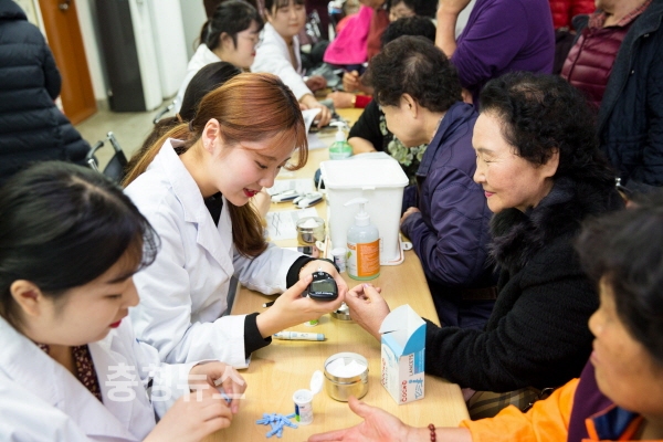 이날 봉사활동은 간호학과 김희정 교수의 ‘건강한 삶을 위한 생활습관 만들기’ 강의를 시작으로 혈당, 혈압, 콜레스테롤 검사 등 검강검진과 식사대접 순으로 진행됐다.