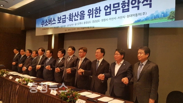 양해각서 체결은 조명래 환경부장관, 성윤모 산업통산자원부장관, 김정렬 국토부2차관, 현대자동차 정진행 사장과 오세현 아산시장 등 8개 특별・광역・기초 단체장이 참석해 「수소버스 시범사업의 원활한 추진」과 「수소버스의 확산」, 「수소버스의 시범사업에 대한 홍보강화」에 대한 업무협약으로 진행됐다.