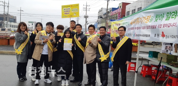 이들은 홍성 5일 시장, 명동골목, 공무원주택 등 유동인구가 많은 지역을 2시간 가량 돌며 복지위기가구 발굴을 위한 지역주민의 인식 확산을 위해 홍보물 배부 및 거리 캠페인을 펼침으로써 주변의 어려운 이웃에 대한 관심을 촉구했다.