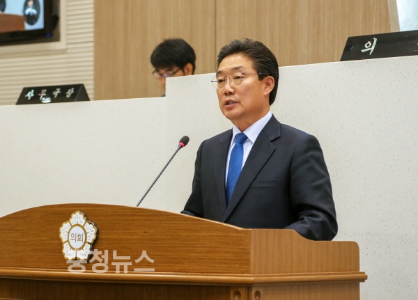 김홍장 당진시장이 23일 당진시의회 본회의장에서 열린 제58회 당진시의회 제2차 정례회 개회식에서 민선7기 첫 시정연설을 했다.