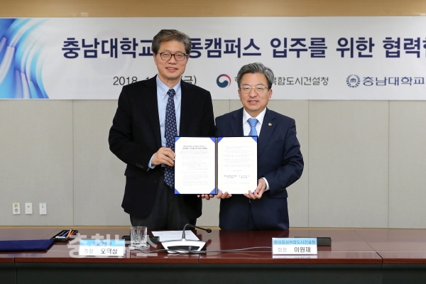 행정중심복합도시건설청(청장 이원재, 이하 행복청)과 충남대(총장 오덕성)는 23일 행복청에서 공동캠퍼스 입주를 위한 합의각서(MOA)를 체결했다고 밝혔다.