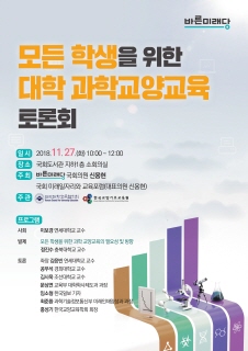 바른미래당 신용현 의원, 국회 미래일자리와 교육포럼이 공동 주최하고 한국대학교육협의회와 한국교양기초교육원이 공동주관하는 ‘모든 학생을 위한 대학 과학교양교육’ 토론회가 11월 27일 오전 국회도서관 소회의실에서 개최된다.