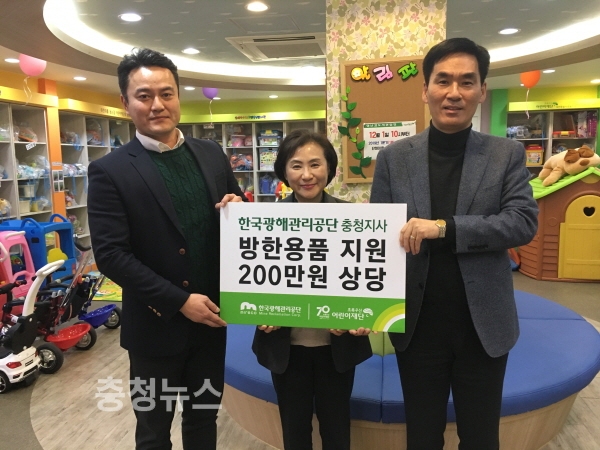 한국광해관리공단 충청지사(최상욱 지사장)는 26일 초록우산 어린이재단 대전종합사회복지관(관장 유미)에 방문하여 저소득가정 아동들이 추운 겨울을 따뜻하게 보낼 수 있도록 200만원 상당의 방한 용품(차렵이불 셋트)을 전달했다.