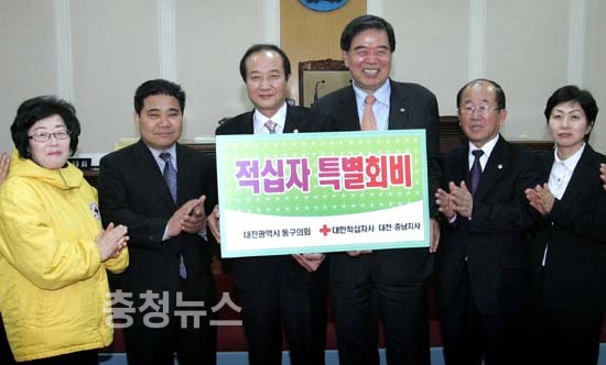 ▲ 대전 동구의회(의장 김종성)는 30일 의회 사무실에서 대전․충남 적십자사 박건영 회장에게 2009년 적십자 특별회비 1백만 원을 전달했다.(사진 맨 오른쪽부터 이나영 의원, 김무길 부의장, 박건영 회장, 김종성 의장, 김종식 의원)