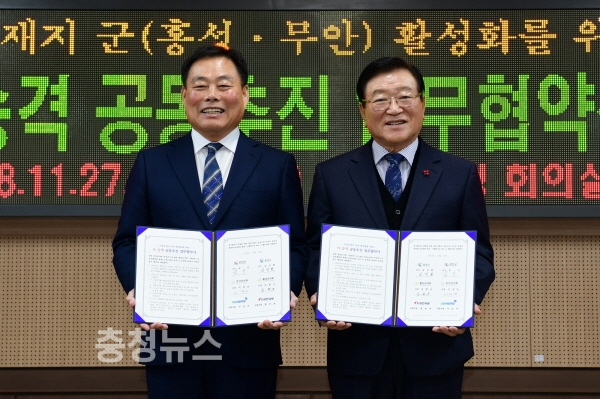 충남도청 수부도시 홍성군은 지난 27일 홍성군청 회의실에서 전남도청 소재지인 무안군과 함께 시 승격을 위한 공동추진 업무협약을 맺고 본격적인 상생발전 행보에 나섰다.