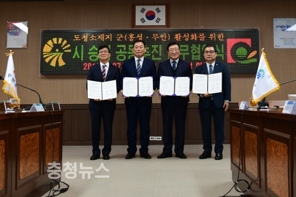 김석환 홍성군수와 김헌수 홍성군의회 의장, 김 산 무안군수, 이정운 무안군의회 의장 및 관계 공무원들이 참석한 가운데 열린 이 날 협약식에서는 도청소재지 郡의 시 승격 공동 추진을 위한 업무협약 체결과 공동건의문 작성 등이 진행되었으며, 홍성·예산 지역구인 자유한국당 홍문표 국회의원과 영암·무안·신안 지역구인 더불어민주당 서삼석 국회의원은 이번 협약에 따른 공조를 진행하기로 했다.