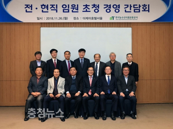 한국농수산식품유통공사(aT, 사장 이병호)는 11월 26일(월) 서울에서 전임 임원을 초청해 '지속가능 농식품 발전을 위한 전‧현직 임원 경영간담회'를 개최했다.