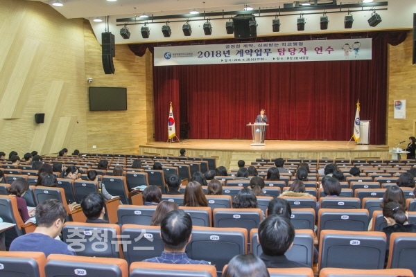 세종시교육청(교육감 최교진)은 28일 세종시교육청 2층 대강당에서 본청 및 직속기관, 관내 유·초·중·고 계약담당 150명을 대상으로 「2018년 계약업무 담당자 연수」를 실시했다고 밝혔다.