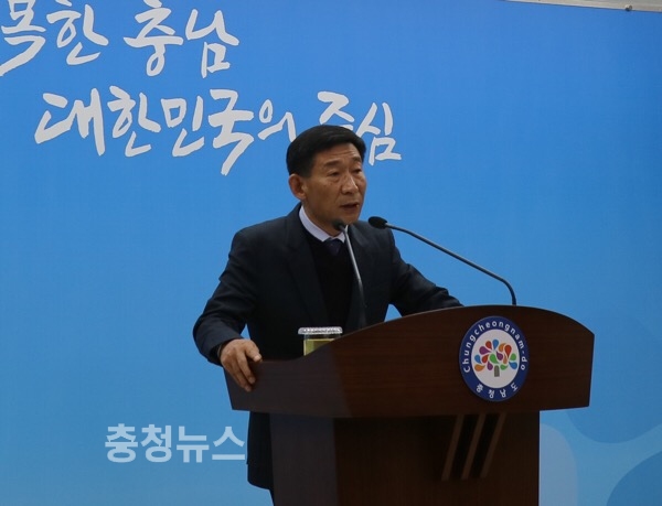 김찬배 공동체새마을정책관은 28일 도청 프레스센터에서 브리핑을 하고 있다.