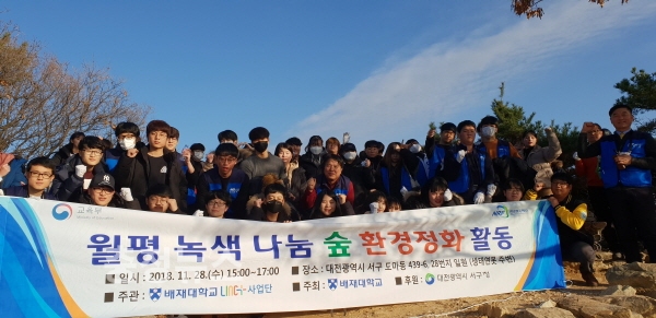 배재대 LINC+사업단(단장 최창원)은 28일 교수‧학생 100여명이 참여한 가운데 월평녹색나눔숲 및 도솔산 환경정화에 나섰다.