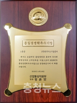 또한 품질경쟁력 우수기업 부문에서 3년 연속 1등급(품질경쟁력 우수기업 7년)으로 선정되어 산업통상자원부장관 선정증서 및 선정패를 수상하는 쾌거를 거두었다.