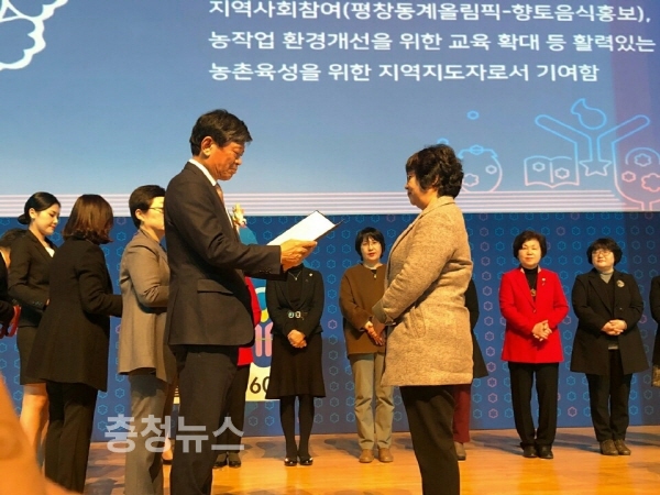 사진설명: 생활개선회 활동 60주년 기념식에서 박경신 회장이 대통령상을 수상하고 있다.