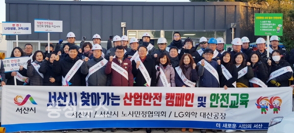이날 캠페인 및 안전교육은 산재사고 고위험 사업장인 석유화학 산업 근로자들의 안전의식을 제고하고 올바른 화학물질 취급 및 보관을 통한 안전한 사업장을 만들기 위해 실시됐으며, LG화학(안전환경팀 및 노동조합), 서산고용센터, 서산상공회의소 등 산재 및 고용․노동과 관련된 기관에서 40여명이 참여했다.