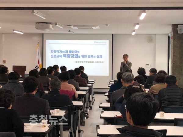 충청북도진로교육원 김기탁 원장은 ‘자유학기제 활성화와 진로교육역량강화를 위한 교육의 실제’를 주제로 유연성을 갖춘 진로교육의 필요성에 발맞추어 진행한 진로체험 구성의 원칙과 진행과정의 어려움 등을 나누었다. 또한 지역사회와의 협력, 학생 개별 체험 활용 방안의 강구, 강사의 역량강화를 위한 노력의 중요성을 강조했다.