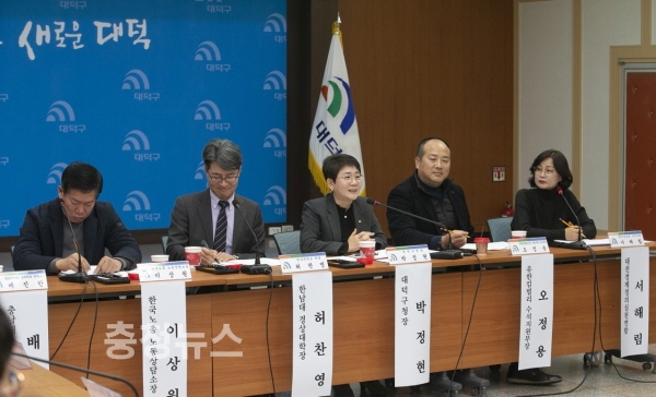 지난 30일 대덕구청 중회의실에서 열린 대덕구 ‘노사민정 포럼’에서 토론자로 나선 박정현 대덕구청장(왼쪽 세 번째)]
