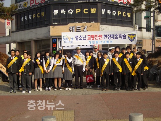 대전둔산경찰서(서장 한달우)에서는´.6일오후2시~4시동안 둔산동 소재 계룡네거리와 유성구 소재 궁동네거리 2곳에서 청소년 교통안전 의식 향상을 위하여 중학생 110명을 대상으로 교통 현장체험 교육을 실시하였다.