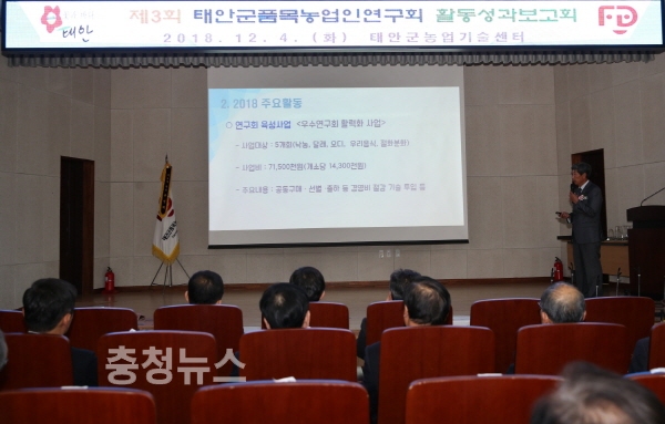 충남 태안군 농업기술센터 농업인교육관(창조관)에서 지난 4일 가세로 군수와 지역 농업인 등 200여 명이 참석한 가운데 ‘제3회 품목농업인연구회 활동성과보고회’가 개최됐다.