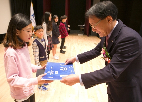 내고향 물 살리기 실천수기 공모전에서 초등부 대상 이서연 학생(왼쪽)이 상패를 받고 있다