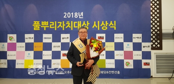 충남도의회 김명선 의원(당진2)이 7일 세종시 조치원읍 수정웨딩&컨벤션홀에세 개최된 『제10회 2018 풀뿌리자치대상』에서 ‘의정발전대상’을 수상했다.