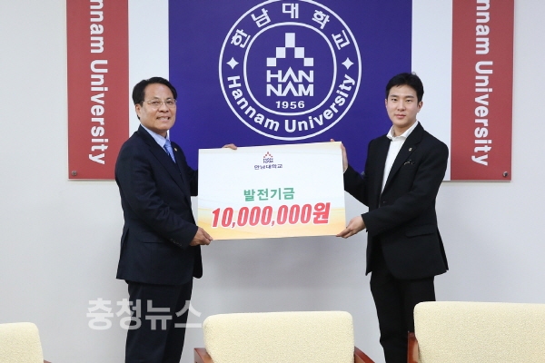㈜얼썸 대표 최한얼 씨(사진 오른쪽)가 이덕훈 한남대 총장에게 발전기금 1000만원을 기탁하고 있다.