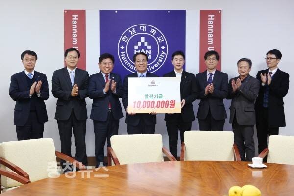 ㈜얼썸 대표 최한얼 씨(사진 오른쪽 네번째)가 이덕훈 한남대 총장(왼쪽 네 번째)에게 발전기금 1000만원을 기탁하고 있다.