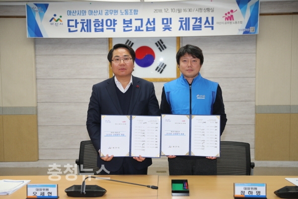 충남 아산시(시장 오세현)는 아산시 공무원 노동조합(위원장 정하명)과 지난 10일 시청 상황실에서 단체협약을 체결했다.