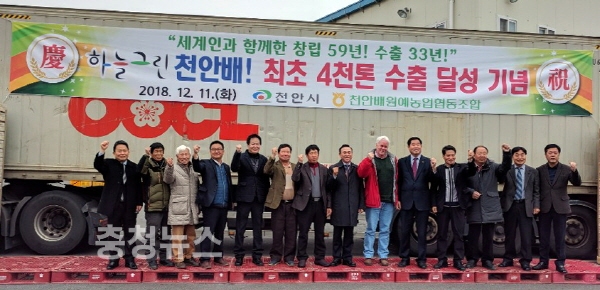 충남 천안시와 천안배원예농협은 11일 율금유통센터(APC)에서 시 관계자, 농협 관계자, 수출농업인 등이 참석한 가운데 올해 천안배 수출 4000톤 달성 기념식을 열었다고 밝혔다.