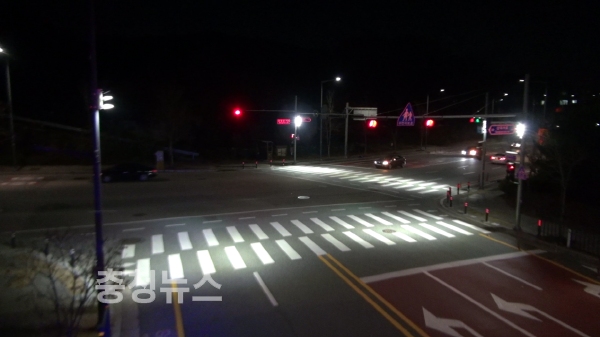대전 유성구(구청장 정용래)가 야간 교통사고 예방을 위해 횡단보도 21개소에 LED집중조명시설 또는 바닥조명을 설치했다고 11일 밝혔다.