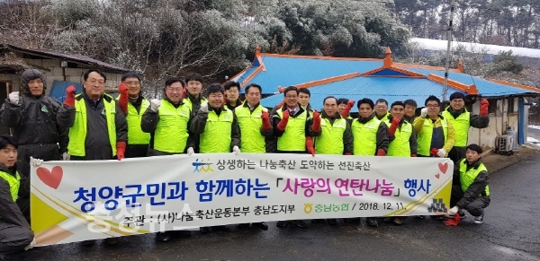 농협 충남지역본부(본부장 조소행)는 나눔축산운동본부 충남도지부(지부장 천안축협 조합장 정문영), 청양축협(조합장 임철규)과 함께 11일 청양군 청양읍에서 관내 소외계층에 대한「사랑의 연탄나눔」 행사를 진행했다.