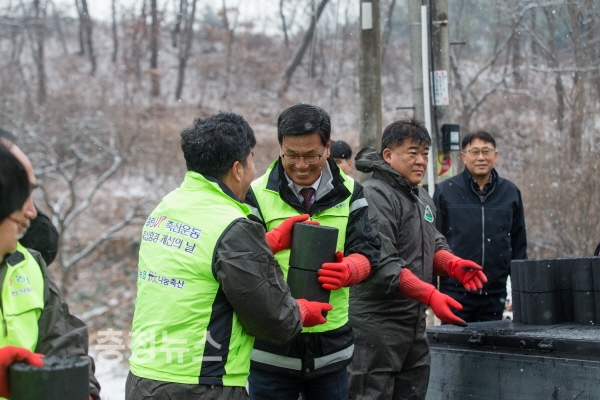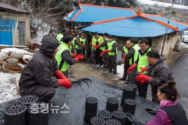 이날 김돈곤 군수와 윤일근 지부장을 비롯해 군 공무원 및 농협 관계자 총 20여명은 청양읍 교월리에서 추운 날씨에도 불구하고 500장의 연탄을 직접 배달해 따뜻한 온기를 함께 전달했다.