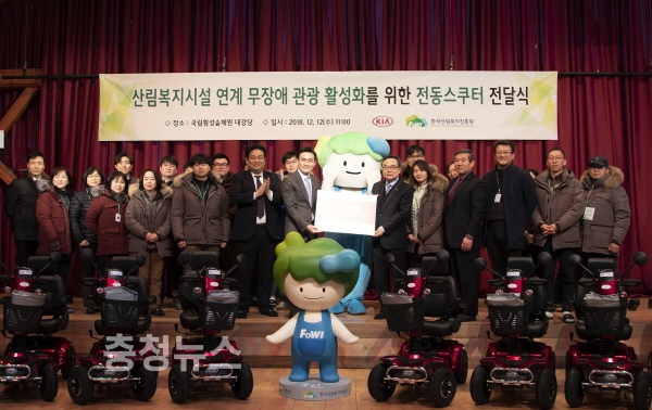 산림청 한국산림복지진흥원(원장 윤영균, 이하 진흥원)은 12일 강원 횡성군 둔내면 소재 국립횡성숲체원에서 윤영균 진흥원장, 노계환 기아자동차 CSR경영팀 부장, 한정재 (사)그린라이트 사무국장 등 30여 명이 참석한 가운데 전동 스쿠터 전달식을 가졌다고 밝혔다.