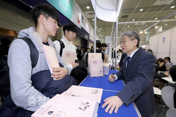 백웅기 상명대 총장은 박람회 첫날 박람회장을 둘러 본 후 상담부스를 찾은 예비신입생들에게 직접 정시모집요강을 배부하고 대학을 홍보했다.
