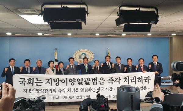 간담회에 이어 전국 시장군수구청장의 뜻을 모아 중앙사무의 신속한 지방 일괄 이양을 위한 법안인 지방이양일괄법 즉시처리를 촉구하는 성명서를 국회정론관에서 발표했다.