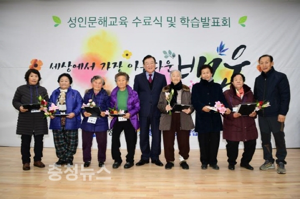 김석환 홍성군수는 “지난 세월 어려운 환경 속에서 배움의 기회를 놓친 분들이 늦게나마 문해교육을 통해 글을 깨우치고 수료식을 하게 되어 이보다 뜻깊은 일이 또 있겠느냐”며 “앞으로도 배움을 지속할 수 있도록 학력인정 예비과정 개설 등 학습 기회를 더욱 확대해 나가겠다.”고 밝혔다.