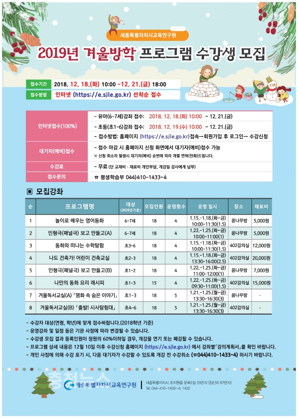 세종교육연구원(원장 김상학)은 2019년 겨울방학을 맞아 유아와 초등학생을 대상으로 총 8개 강좌에 참여할 수강생을 모집한다고 18일 밝혔다.