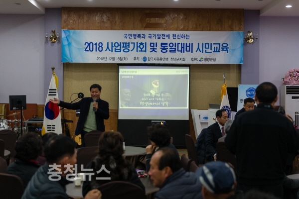 한국자유총연맹 청양군지회(지회장 유석근)는 지난 18일 청양읍 소재 라온웨딩홀에서 회원 140여명이 참석한 가운데 사업평가회 및 통일대비 시민교육을 개최했다.