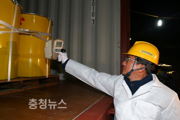 19일 새벽 한국원자력 환경공단에 보관 중인 방사성폐기물 125드럼(200L/1드럼)이 경주 처분시설로 이송되기에 앞서 정용래 유성구청장이 현장을 방문해 방사선량을 측정하고 있다.
